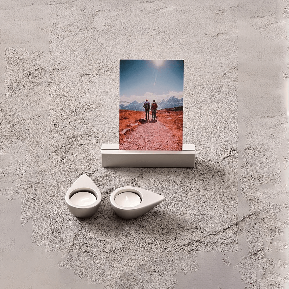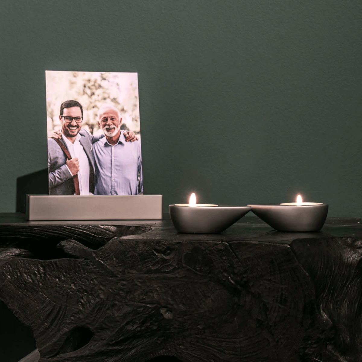 De Chrome-uitvoering benadrukt de balans tussen zachtheid en kracht. Het spiegelende oppervlak vangt het licht van de kaarsjes en verspreidt een warme gloed die troostend werkt. In het midden bevindt zich een fotohouder waarin een dierbaar beeld een plek krijgt. Een blik, een glimlach, een moment dat blijvend is.