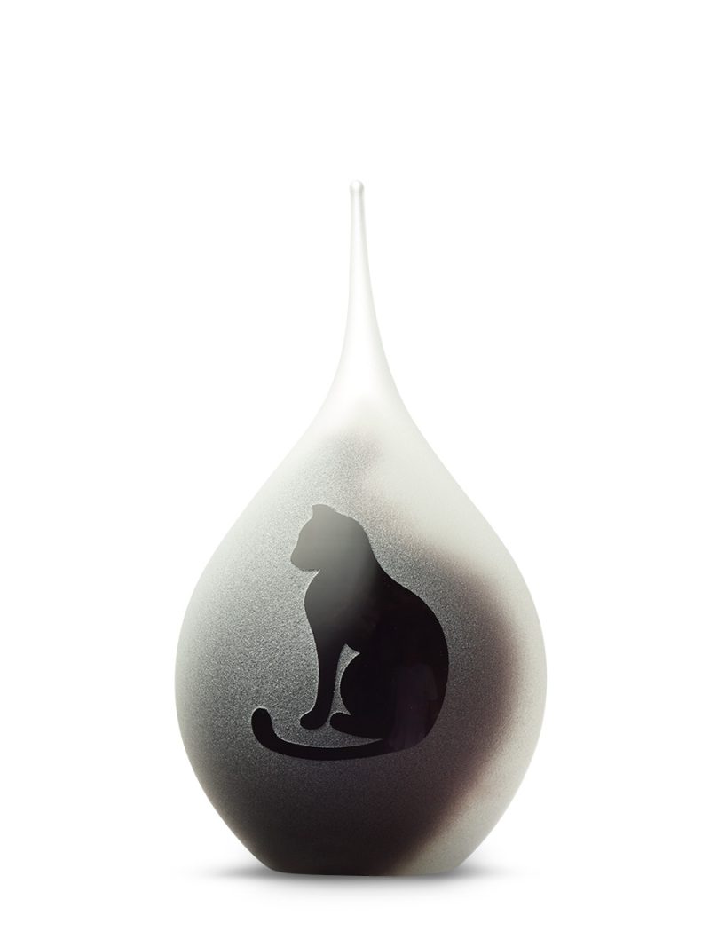 Die Animal Urn – Frosted Drop Cat Sitting | Medium 260 ml wird, wie die anderen Urnen dieser Serie, in Handarbeit hergestellt;